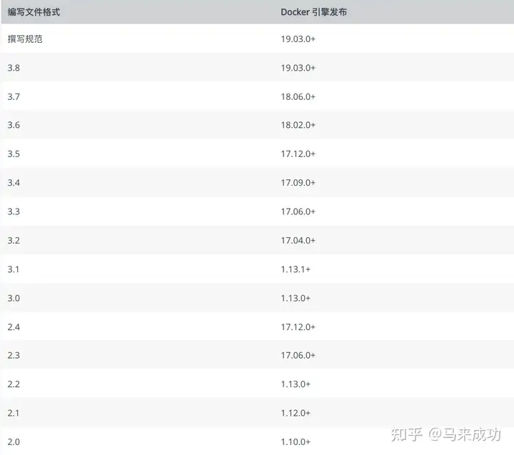 Docker Compose版本与引擎的对应关系如下,可以看到中间主要有两个版本2和版本3两种格式,目前大家使用比较多也就是这两种,对于这两个版本的差别给大家介绍一下: