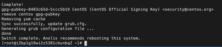 迁移完成后,系统会提示如下信息,表示迁移成功,重启即可进入Anolis OS系统。